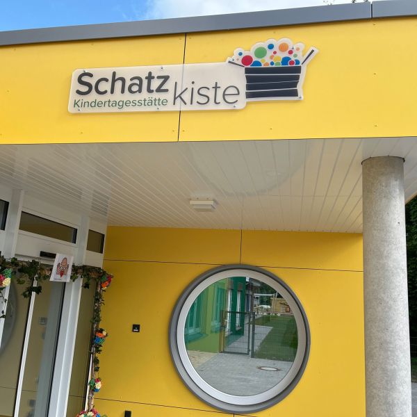 Freundliche und einladende Fassadenbeschriftung für die Kinderstätte Schatzkiste. Wir gestalten und realisieren individuelle Beschriftungen, die Kinderaugen zum Leuchten bringen. Ob bunte Buchstaben, verspielte Motive oder das Logo der Einrichtung – wir setzen Ihre Vorstellungen kreativ um. Wetterfeste Materialien und leuchtende Farben für eine dauerhafte Wirkung.