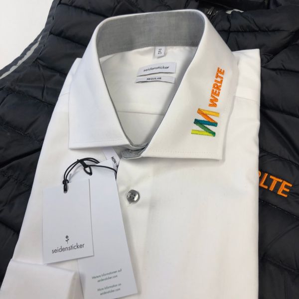 Verleihen Sie Ihrer Dienstkleidung eine persönliche Note: Wir besticken auch Hemdkragen und Westen, wie hier für die Gemeinde Werlte.